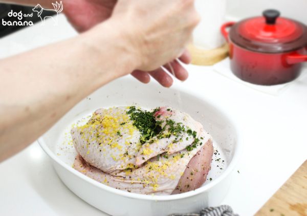 半隻仿土雞洗淨擦乾後放進烤盤,以適量的鹽跟黑胡椒調味,然後把三支去莖切碎的迷迭香、半顆黃檸檬皮屑加入,擠進檸檬汁,最後淋入2大匙橄欖油、1大匙蜂蜜,用手按摩入味後送進預熱200度的烤箱,烤約45分鐘。