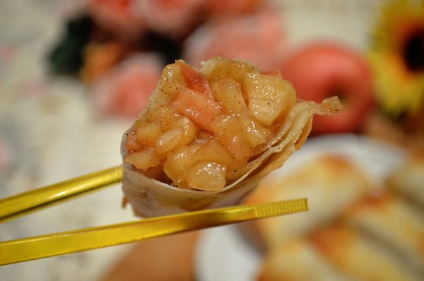 外皮薄脆的春捲包著豐厚綿密的蘋果甜餡。切開春捲,可以看到蘋果粒與糖漿融化在一起,已經被烤成了蜂蜜色。春捲咬一口,先是酥脆口感,接著散出蘋果的酸甜,以及玉桂粉的芳香味,吃來香甜而不膩。