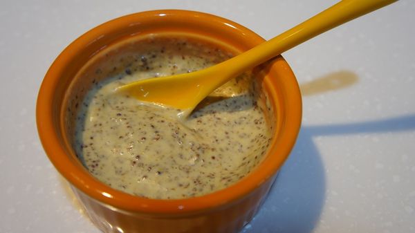 最近喜好好像很明顯偏向西式料理轟。唉呦剛搬好家,就很想很放鬆的在家裡邊聽音樂邊享受餐桌的舒適和用餐的美好咩!是說享受生活的同時營養還是不能偏廢,有魚有多色蔬菜才是均衡的一餐!今天主菜是炸魚,很直覺的就想要沾芥茉籽沙拉醬,就這麼剛好冰箱裡有一罐法式傳統芥末籽醬,單吃芥末籽醬有點重口味,於是最好的朋友桂冠沙拉又出現了,拿來跟芥末籽醬做調和,一方面降低芥末籽醬的比重,另一方面也讓炸魚多了一些熟悉的風味!