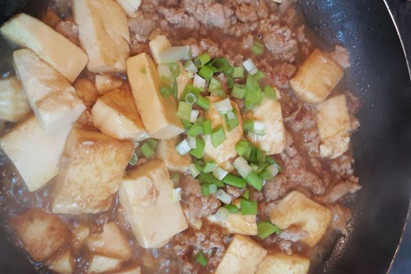 最後把煎好的豆腐和豬絞肉一起拌炒一下,加入適量穀盛壽喜燒、水和蔥花煮滾入味,水稍微收乾即可。